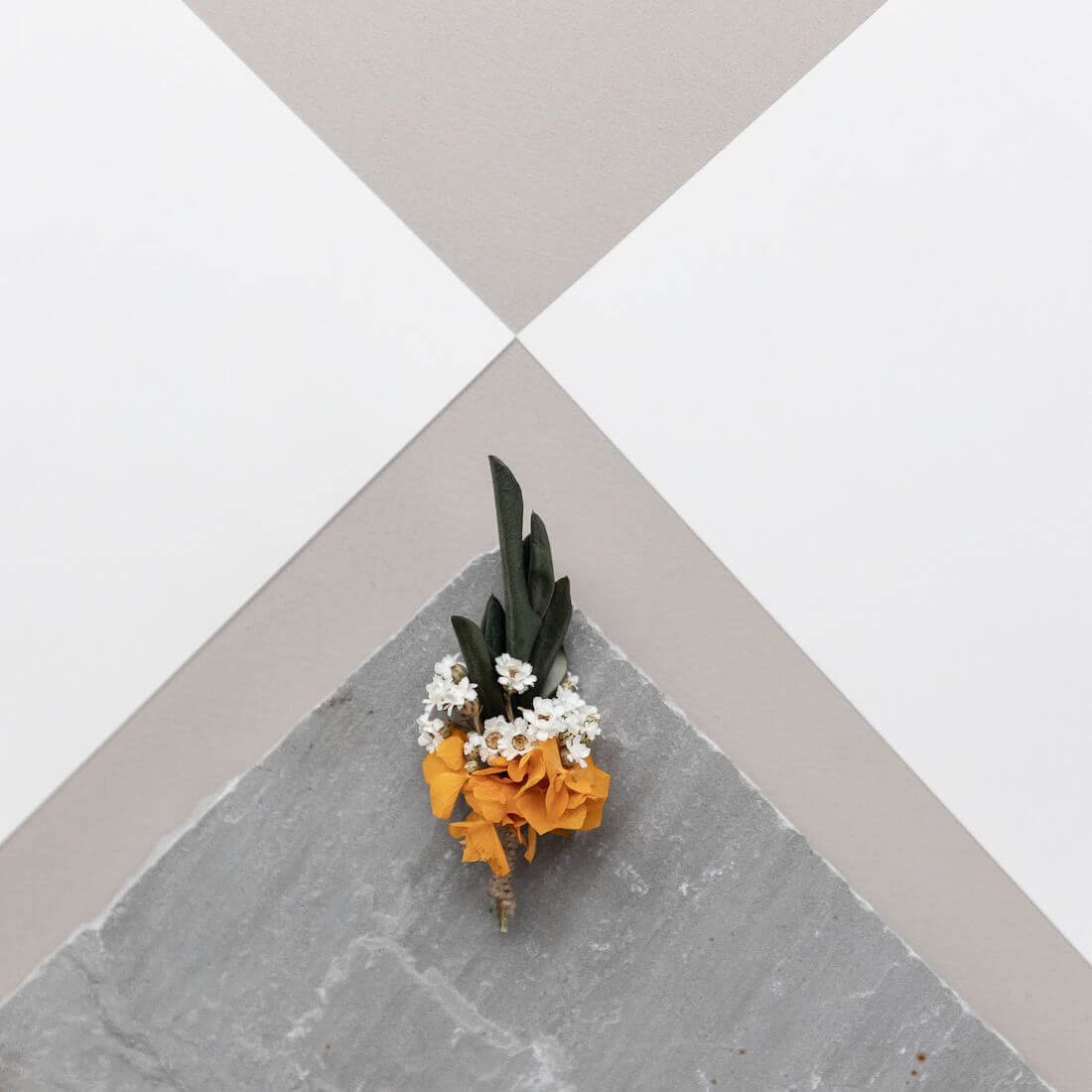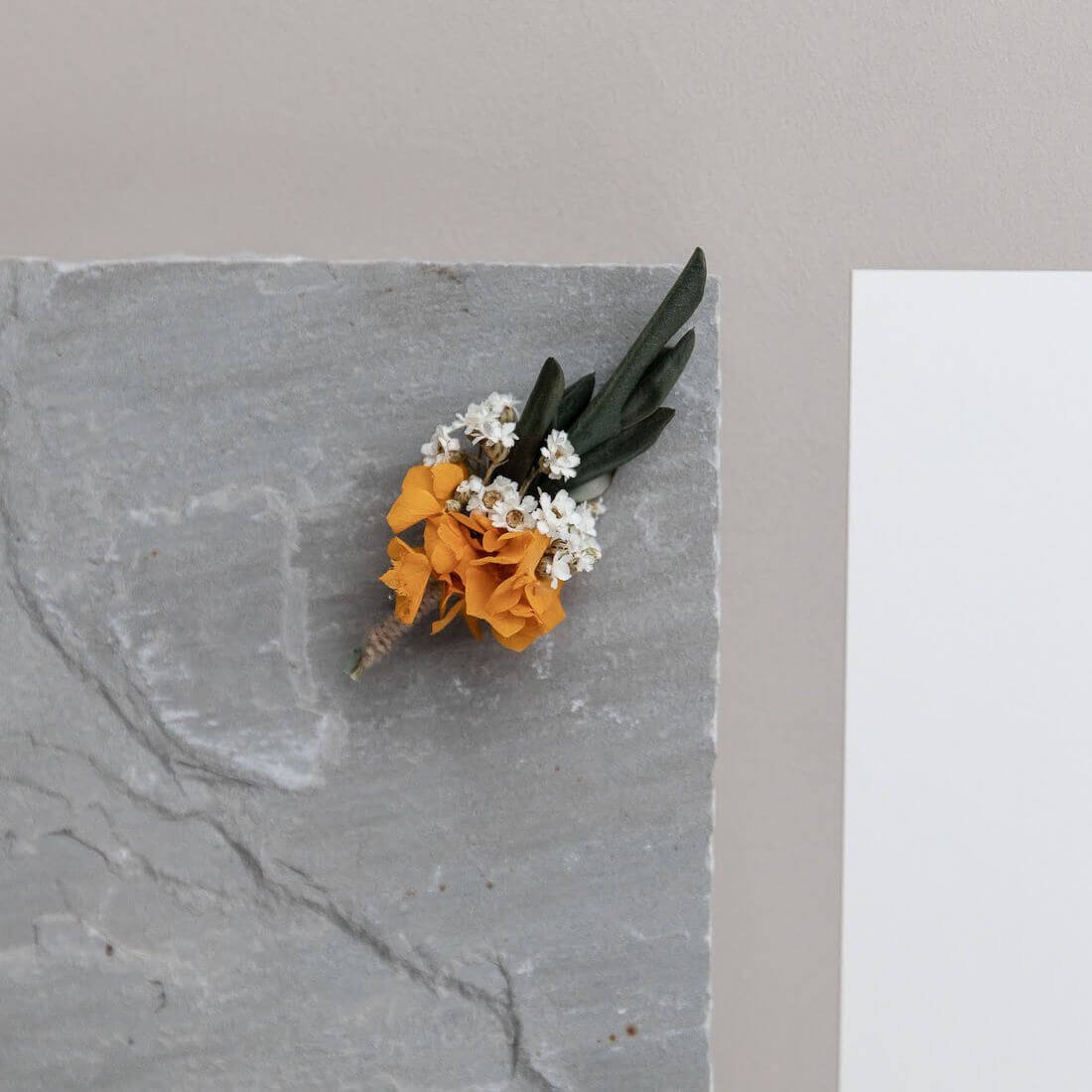 Anstecker aus Trockenblumen in in natürlichen grün, weiß und Orangenen Trockenblumen. Der Hochzeitsanstecker für den Bräutigam oder Trauzeugen aus Trockenblumen ist die perfekte Ergänzung zu unseren Haarschmuck aus Trockenblumen und Brautsträußen aus Trockenblumen in verschiedenen Varianten. Jeder Anstecker ist bereits mit einer Sicherheitsnadel versehen und kann so einfach am Revers angebracht werden._x000D_