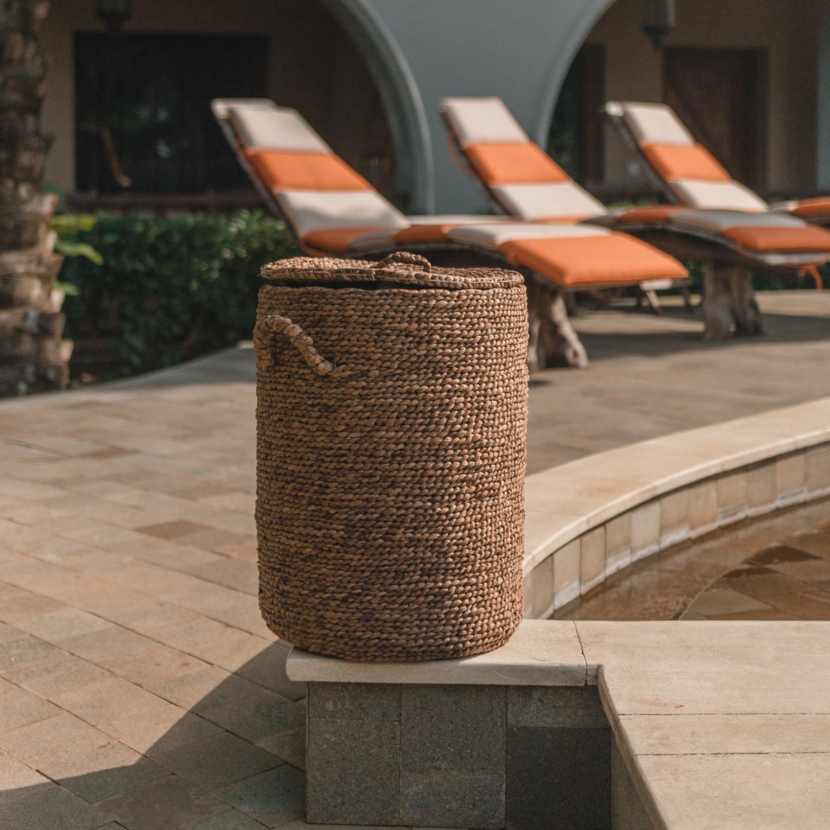 Der handgeflochtene Ikat-Korb aus dicker, schwerer Wasserhyazinthe mit praktischem Deckel und zwei angebrachten Griffen ist der perfekte Organizer für Ihr Badezimmer oder Schlafzimmer.