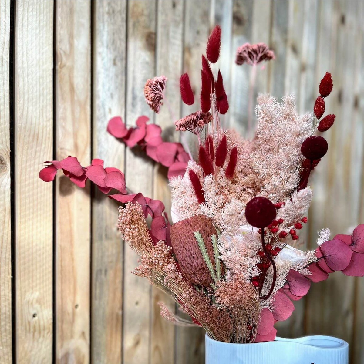 Die auffällige Banksia, mit ihrer einzigartigen Form, bildet das Herzstück dieses besonderen Straußes. In Kombination mit den zarten Ranunkeln und den strahlenden Craspedia-Kugeln entsteht eine lebendige Mischung aus Farben und Texturen.Eukalyptus und Palmspeer verleihen dem Strauß eine erfrischende Note und fügen gleichzeitig einen Hauch von Eleganz hinzu. Die Phalaris-Halme bringen Wärme und Lebendigkeit in das Arrangement, während die grazile Glixia und das luftige Lagurus eine verspielte Note hinzufügen._x000D_