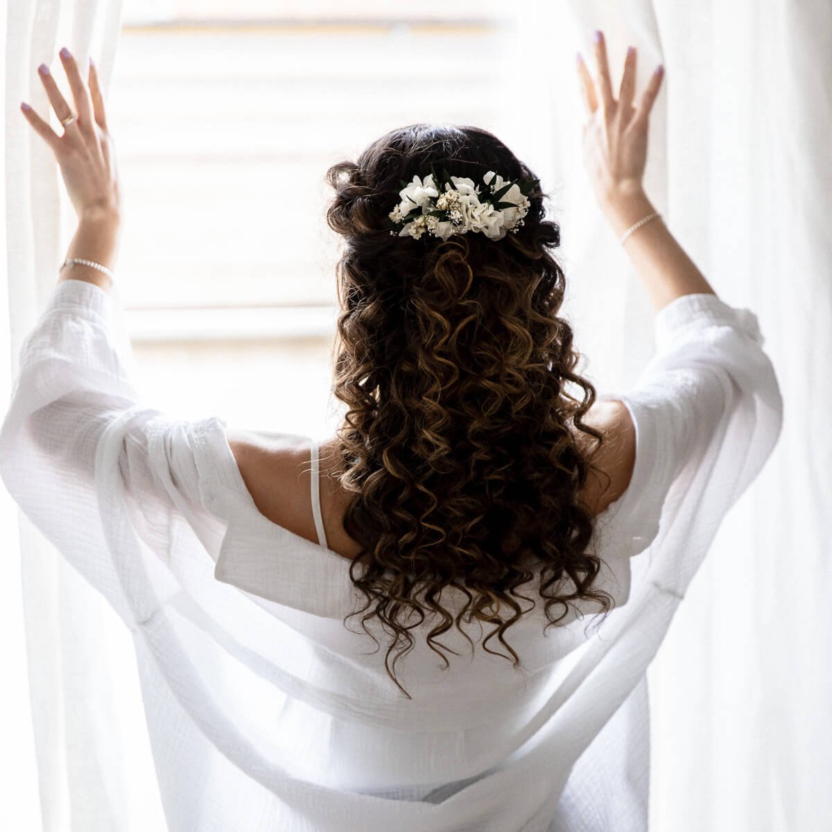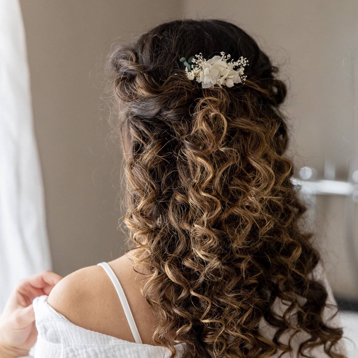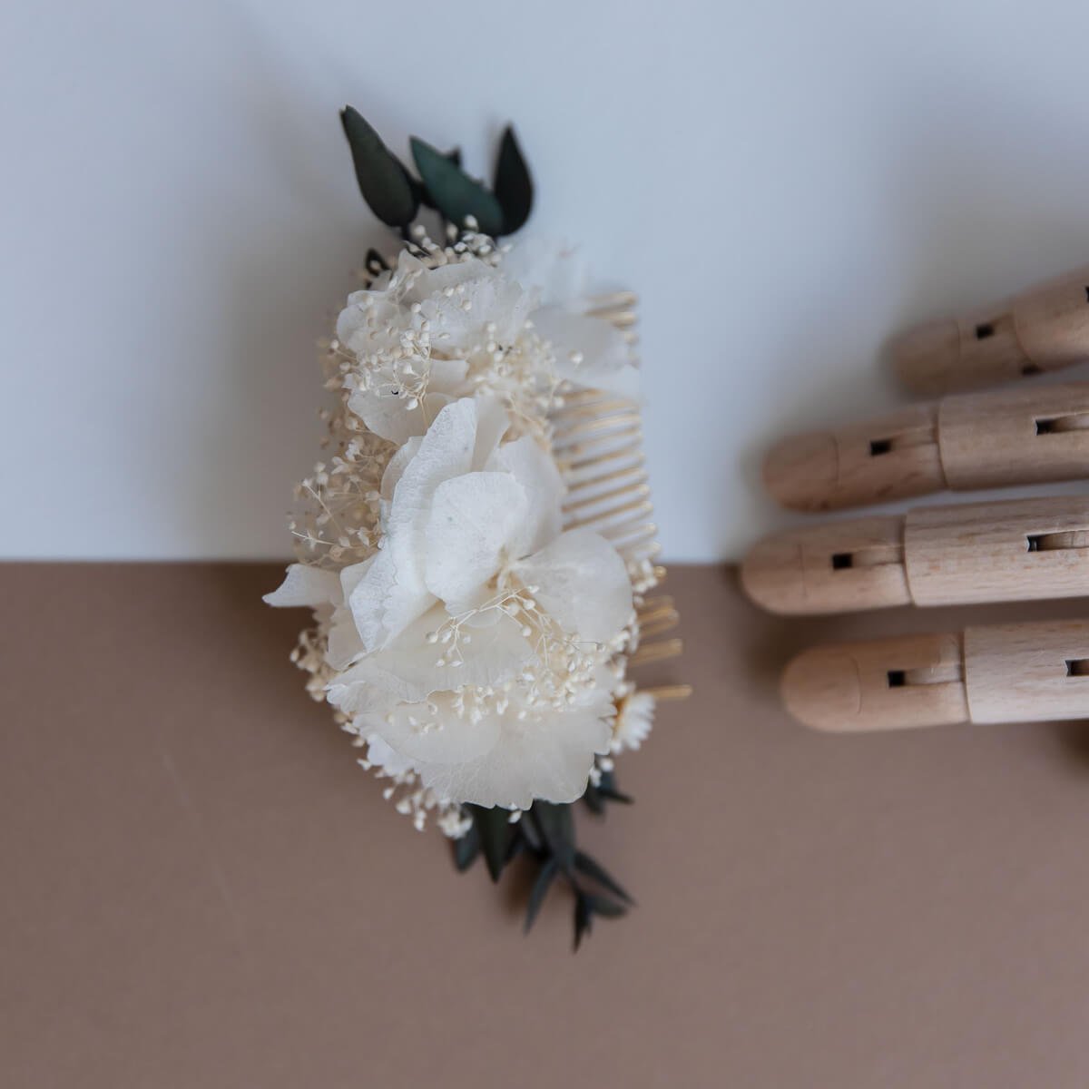 Der Haarkamm aus Trockenblumen ist eine tolle Ergänzung zu unserem Brautstrauß Eukalyptus für die Braut, Trauzeugin oder Brautjungfern. Die filigranen Trockenblumen mit Eukalyptus sind schön sommerlichen zu einer lockeren Hochzeit oder JGA mit Trockenblumen. den Haarkamm aus Trockenblumen mit Hortensie, Schleierkraut und Gänseblümchen passen auch perfekt für Blumenmädchen oder als Haarschmuck zur Kommunion oder Konfirmation._x000D_