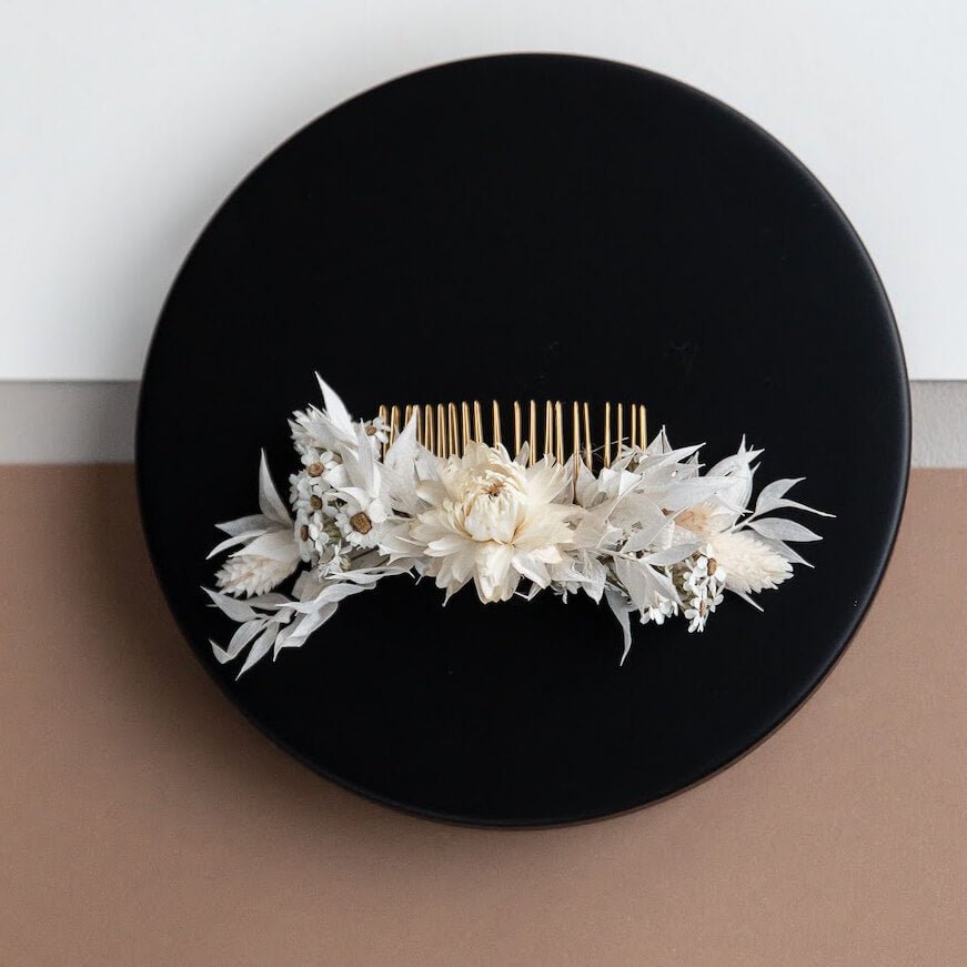 Der Haarkamm aus schlichten Trockenblumen in beige und weiß durfte einfach nicht in unserem Sortiment fehlen. Er ist schön sommerlich und passt zu einer lockeren Hochzeit im Boho Stil. Aber auch im Herbst oder für warme Sommerabende ist der Haarkamm aus Trockenblumen ein toller Begleiter. _x000D_