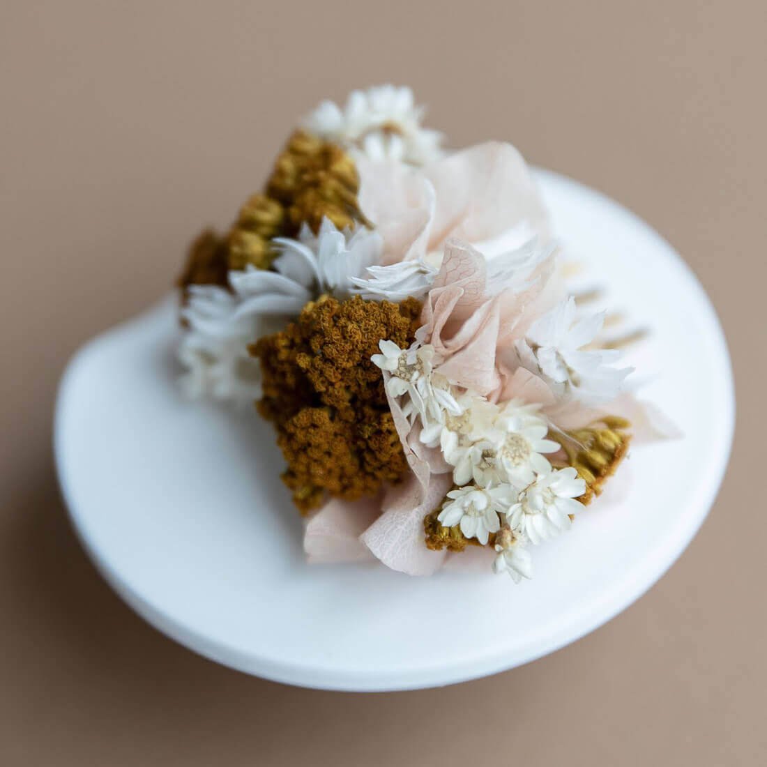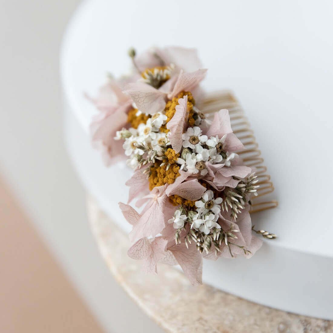 Haarkamm aus Trockenblumen Frühlingshaft, frühlingshafter am frühlingshaftesten. Unser Haarkamm aus Trockenblumen in zarten rosa, weiß und gelb Tönen ist definitiv der frühlingshafteste den ihr finden könnt. Wir sind so verliebt in die Kombination aus zarten Tönen, dass wir direkt auch noch ein Haarreif, Armband und Ohrringe in gleicher Kombination erstellt haben.