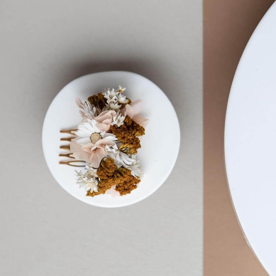 Wir fertigen alle Haarkämme aus Trockenblumen von Hand bei uns in Mainz. Unsere Trockenblumen kommen ausschließlich aus der EU. Jeder Kamm ist ein absolutes Unikat und wird in einer Aufbewahrungsbox in Seidenpapier geliefert._x000D_