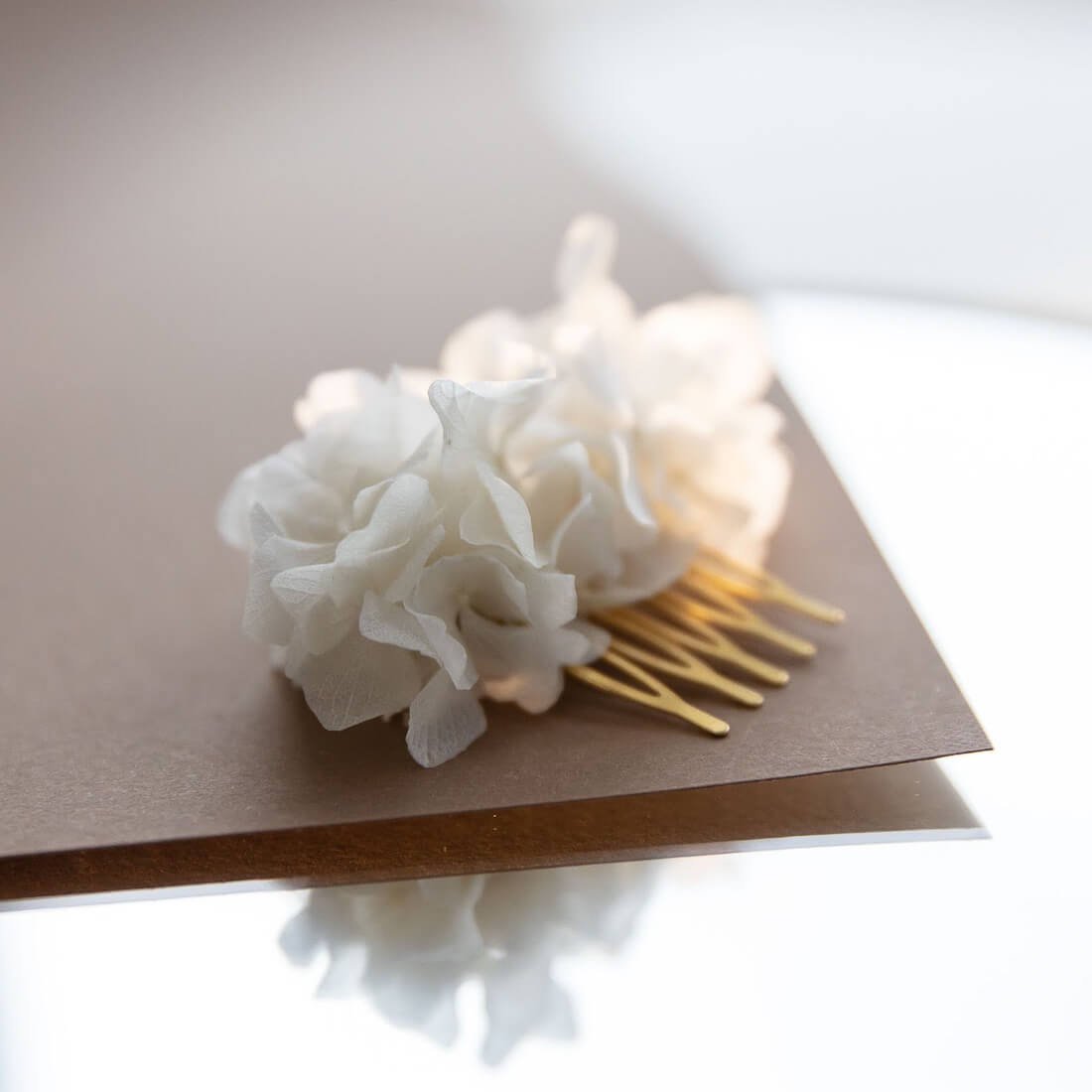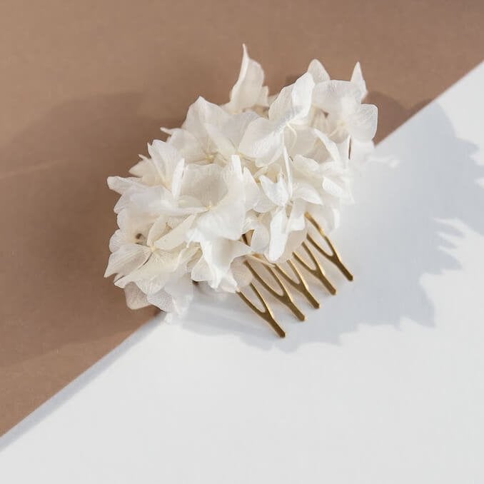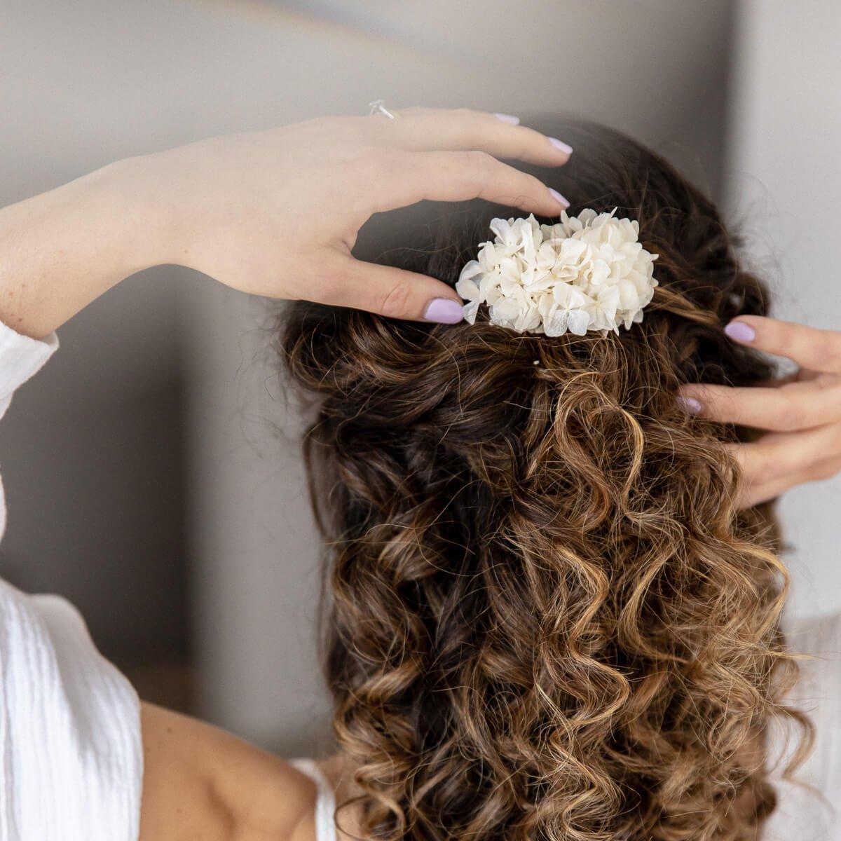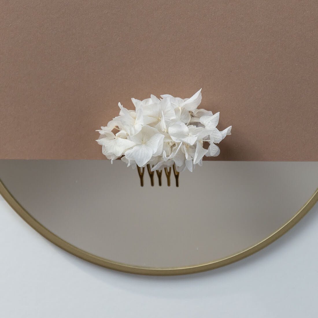 Unser Haarkamm mit konservierten Hortensien wurde mit viel Liebe zum Detail von erfahrenen Floral Designern gefertigt. Jede einzelne, filigrane Hortensienblüte wurde sorgfältig ausgewählt, konserviert und in aufwendiger Handarbeit in den Haarkamm eingearbeitet. So entsteht ein einzigartiges, handgefertigtes Accessoire, das nicht nur wunderschön anzusehen ist, sondern auch von höchster Qualität ist._x000D_