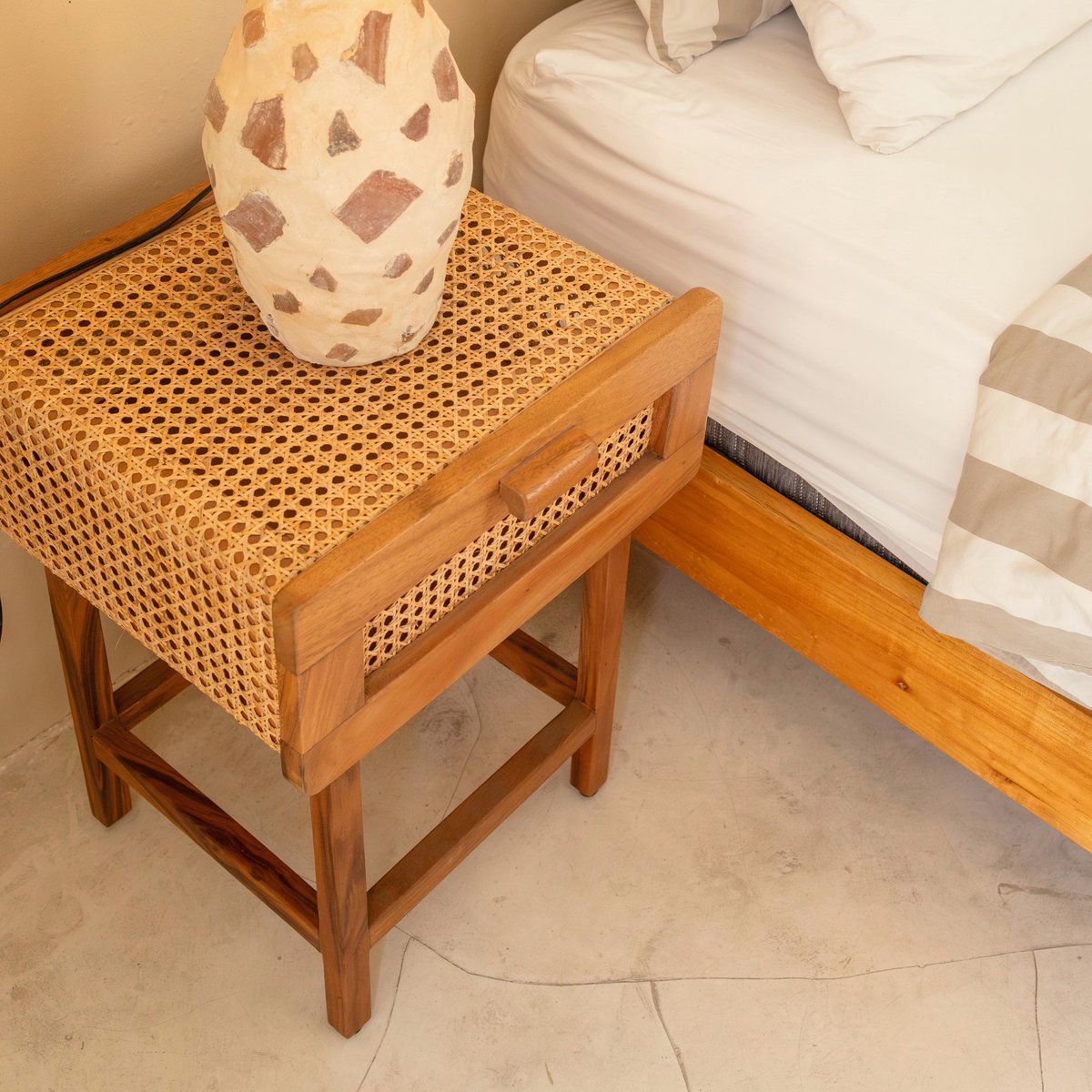 Nachttisch, Nachttisch, Konsole aus Holz und Rattan, handgefertigte Schlafzimmermöbel von JAYA