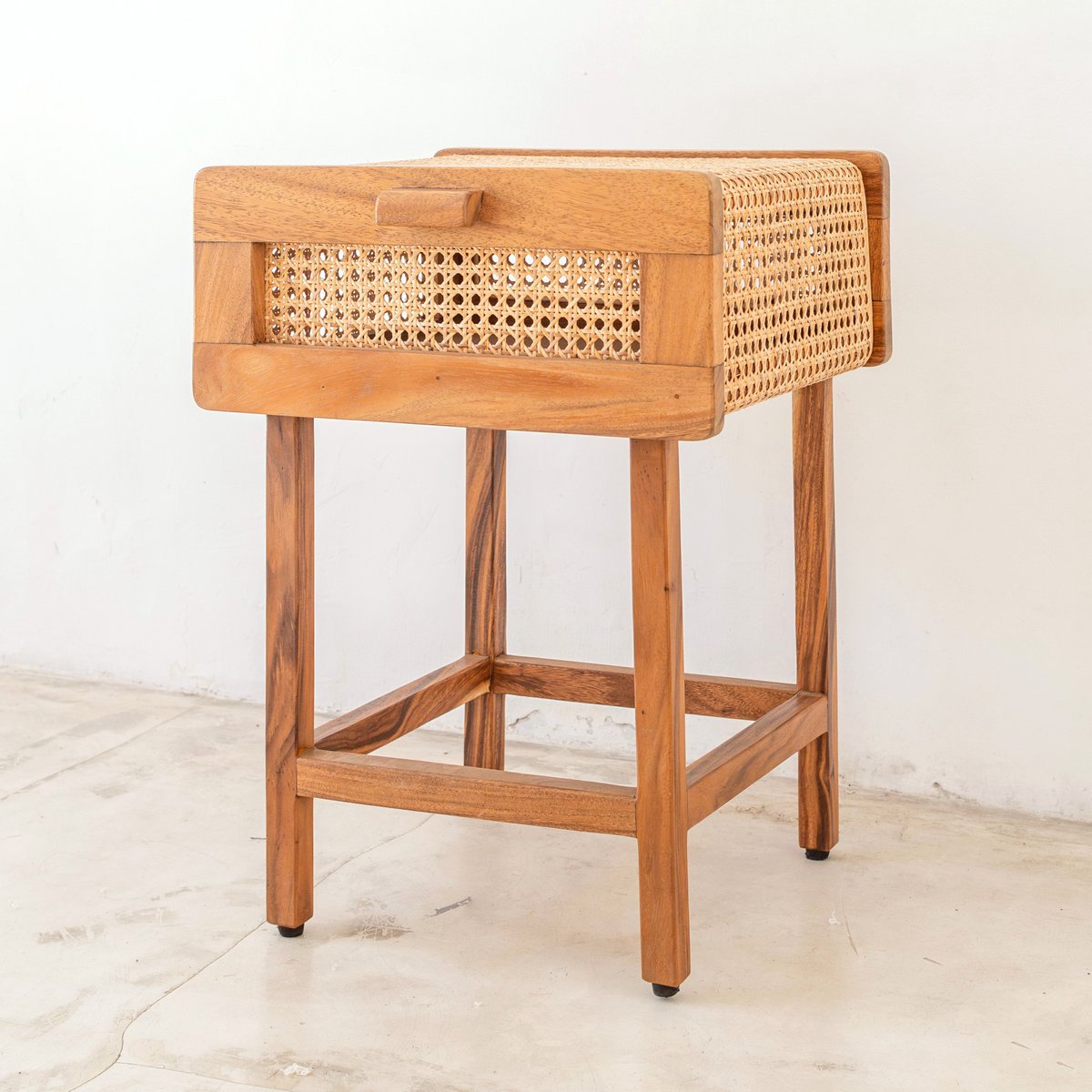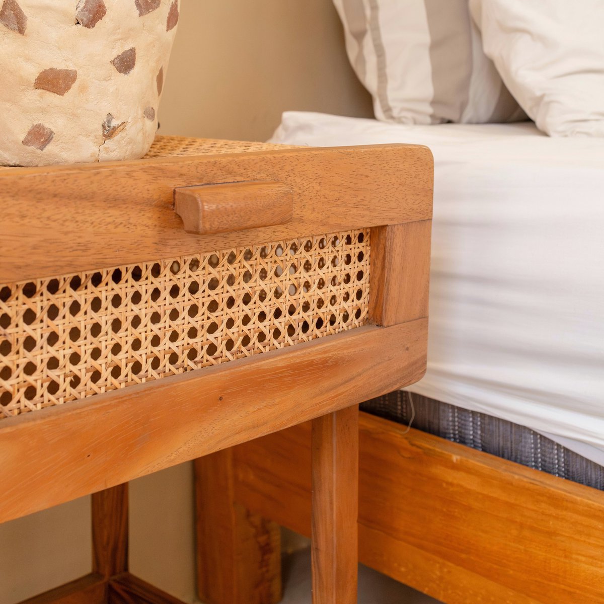 Jaya ist ein kompakter Nachttisch, der Ihr Schlafzimmer mit seinen natürlichen Materialien und seinem zeitlosen, geradlinigen Design aufwertet. Es wird sorgfältig aus Regenbaumholz gefertigt, das für seine hohe Qualität und Nachhaltigkeit geschätzt wird. Erfahrene Handwerker fertigen jeden Nachttisch mit großer Präzision und die kunstvolle Verwendung von geflochtenen Rattanfasern auf der Oberseite und den Seiten verleiht ihm eine zusätzliche Portion Charme.