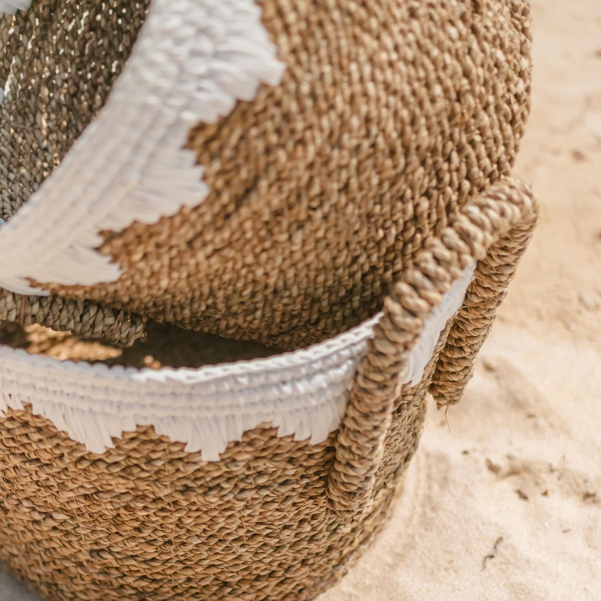 Der handgefertigte Waigeo-Korb ist eine harmonische Kombination aus Seegras am Boden und gewebten weißen Baumwollbändern an der Oberseite des Korbes. Dieser einzigartige Materialmix verleiht dem runden Korb eine ansprechende zweifarbige Optik. Der leuchtende Farbtupfer der Baumwollbänder macht es zu einem echten Hingucker, der in jedem Raum einen schönen Kontrast zur restlichen Inneneinrichtung bildet.
