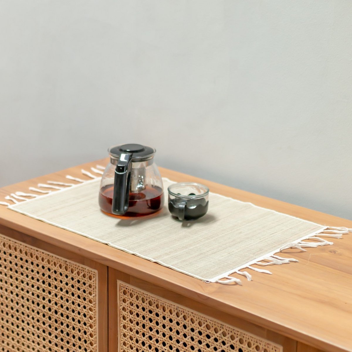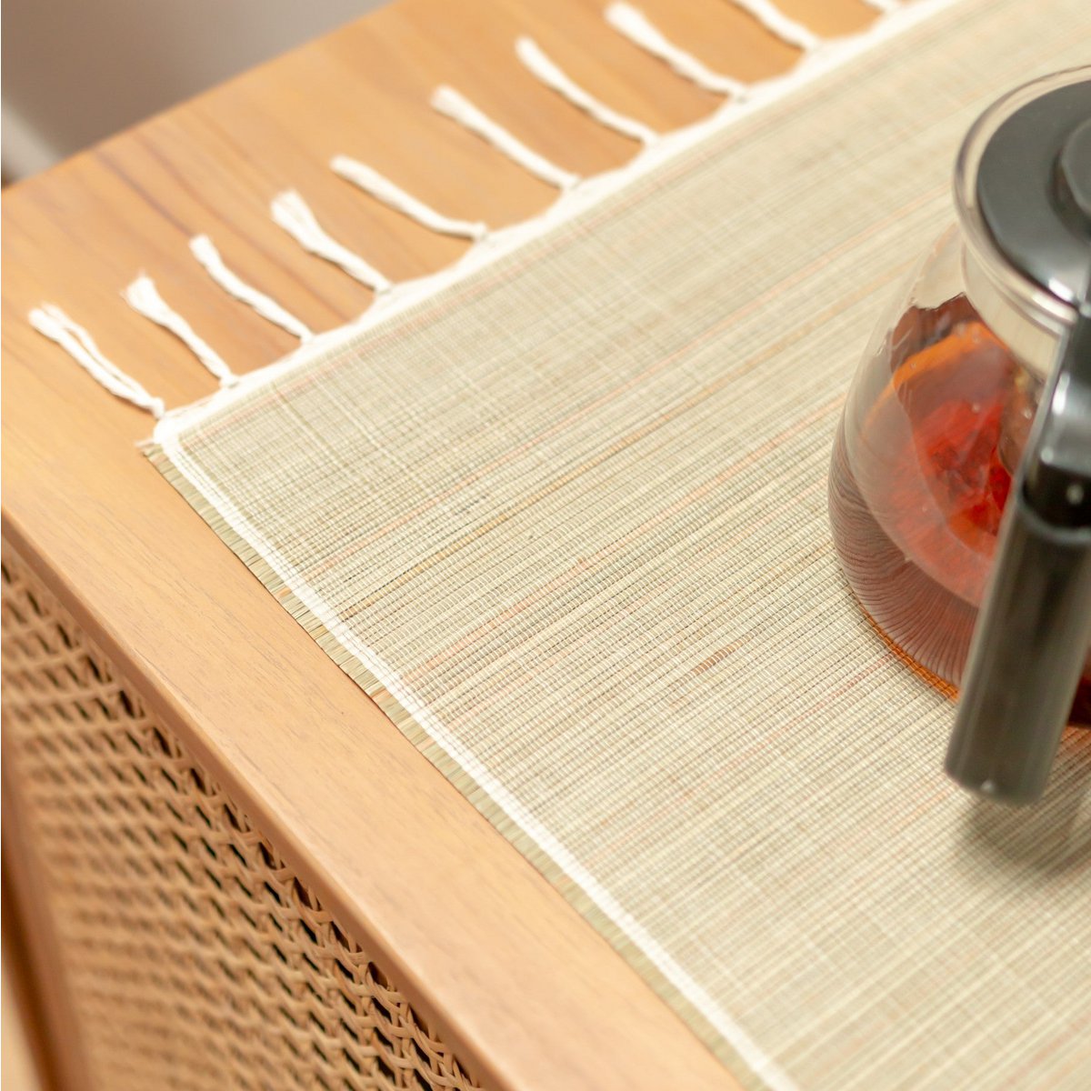 Jambi ist ein wunderschönes Tischset aus in schmale Streifen geschnittenem Seegras. Feine Baumwollfransen runden den Look ab. Mit seiner eckigen Grundform bietet Jambi viel Platz für Teller und Besteck und nutzt so den verfügbaren Platz auf dem Tisch perfekt aus.