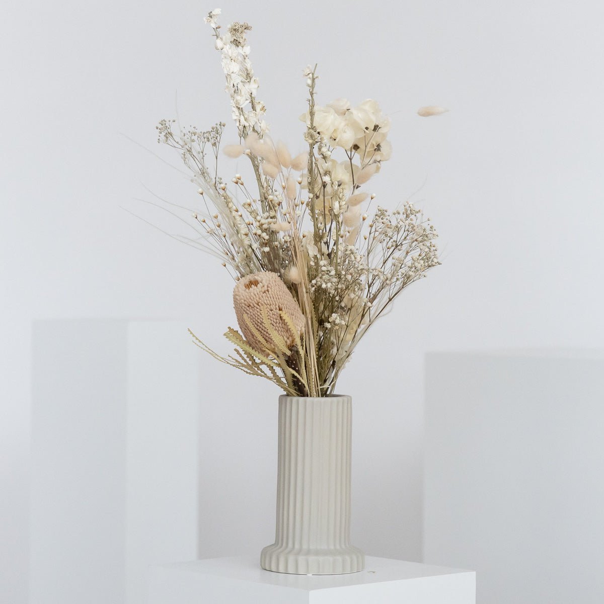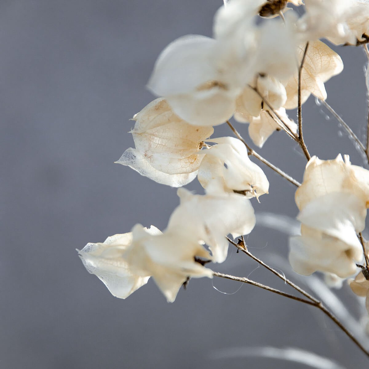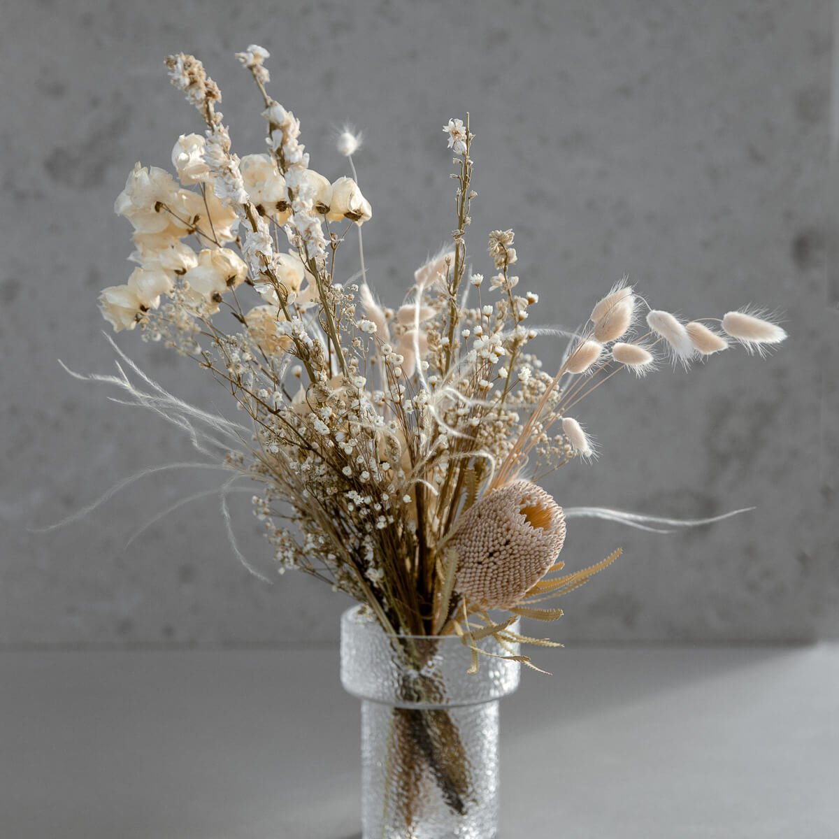 In diesem Trockenblumenstrauß trifft extravaganz auf sportliches Design. Trockenblumen in natürlichen beige und weiß Tönen harmonieren mit leichten grün und erwecken einen frischen und frühlingshaften Look. Der Strauß wirkt durch die Bougainvillea in vanillig warmen Tönen sehr elegant. Die Banksia bildet den eher sportlichen Kontrast. Schleierkraut ummalt mit Glixia und fedrigen Federgras den Trockenblumenstrauß. Die zarten beige Töne liegen absolut im Trend. _x000D_