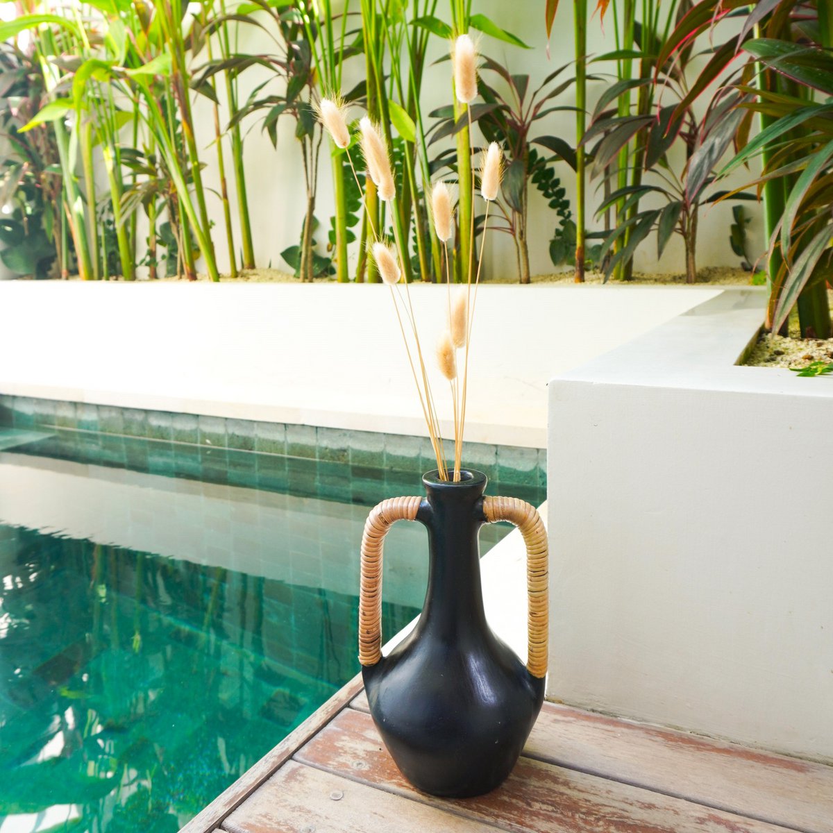 Selayar zeichnet sich durch seine besondere Form aus, die an antike Vasen erinnert. Mit seiner klassischen Kombination aus schlankem Flaschenhals und bauchigem Flaschenkörper wird er mit Sicherheit zu einem Ihrer absoluten Lieblings-Dekoaccessoires. Die schwarze Farbe passt zu jedem Einrichtungsstil und die symmetrischen Griffe auf beiden Seiten, umwickelt mit Rattanfasern, lassen ihn in Ihrem Zuhause besonders harmonisch wirken.