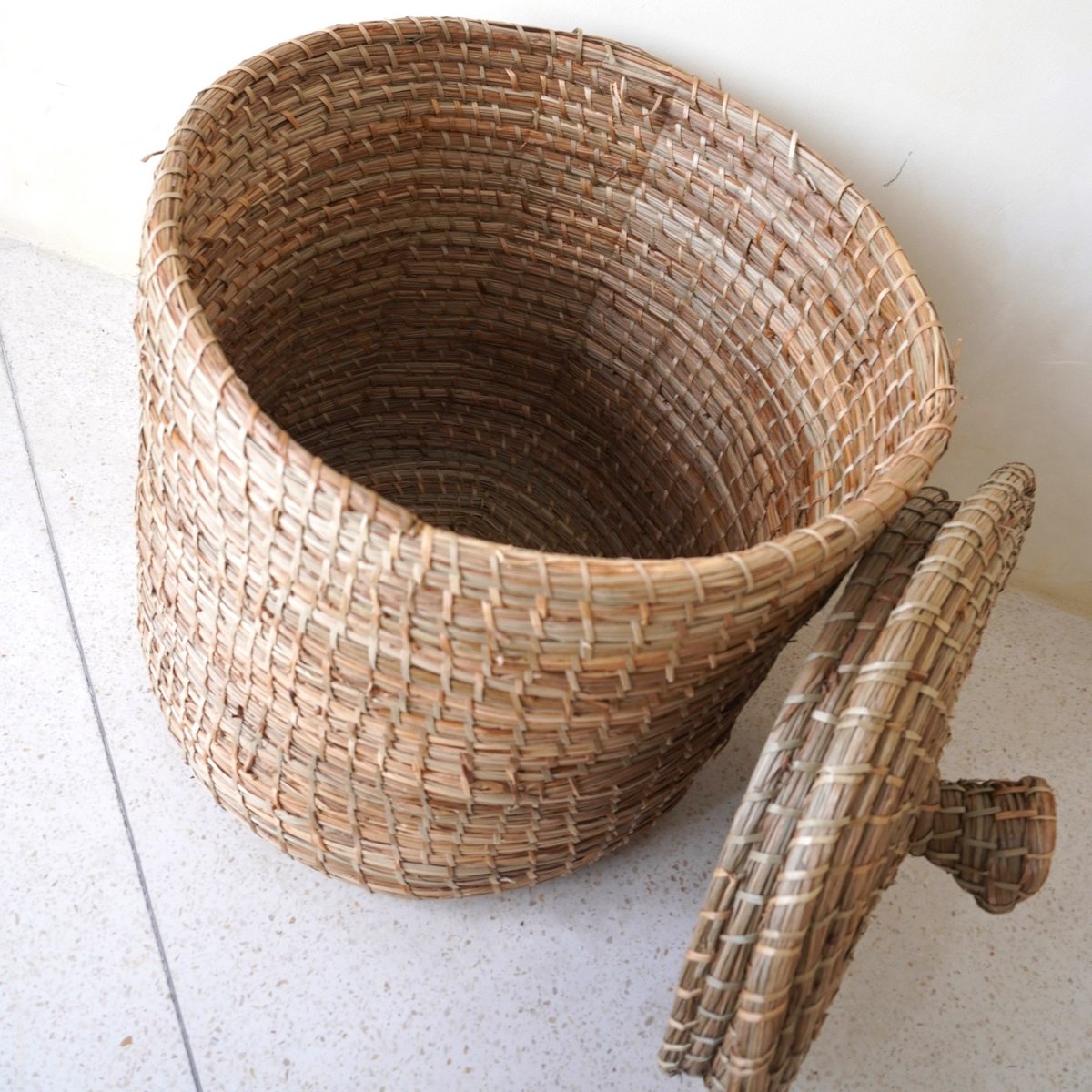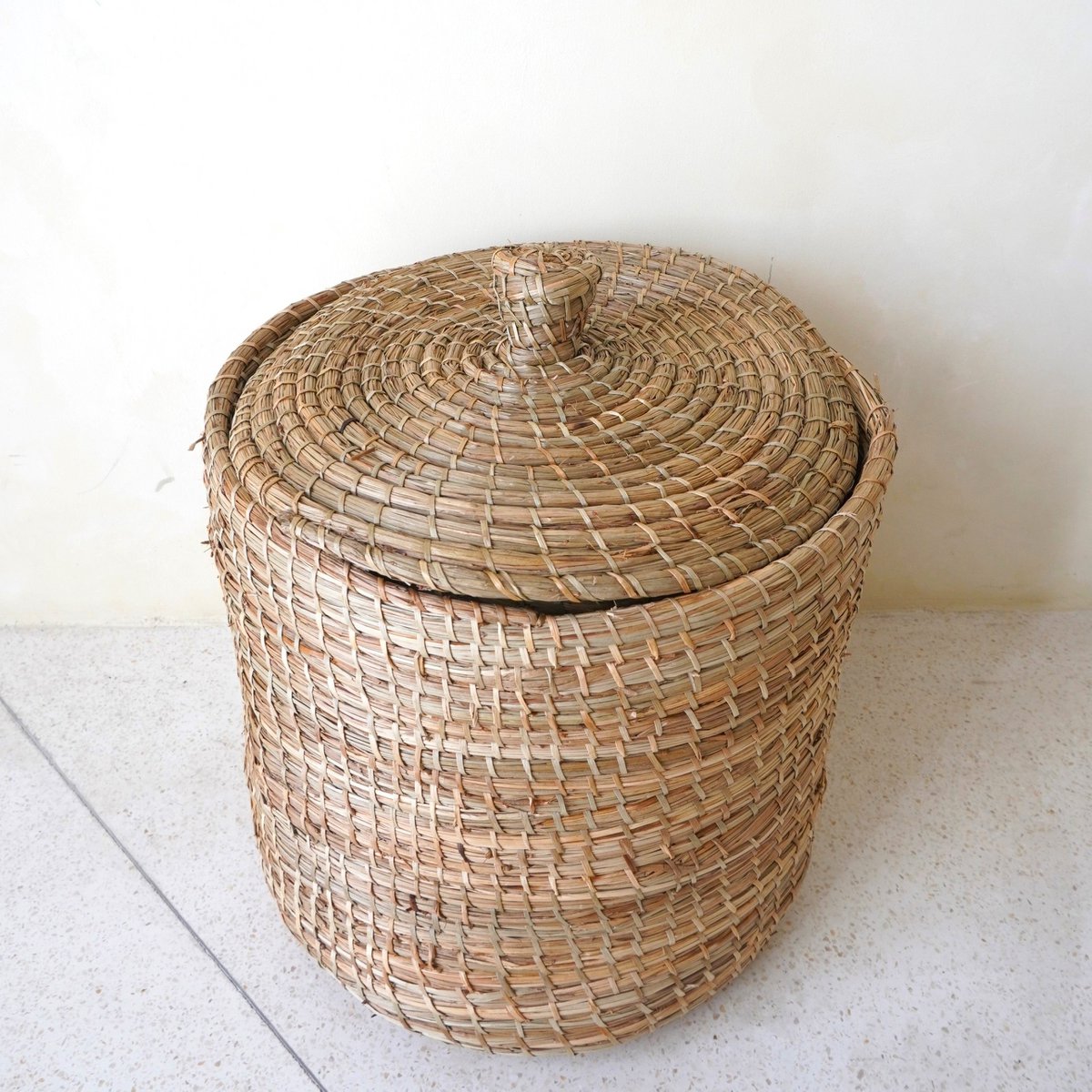 Wäschekorb mit Deckel LANTAI aus Seegras, handgefertigt aus natürlichen Materialien, runder Aufbewahrungskorb für Wäschekörbe