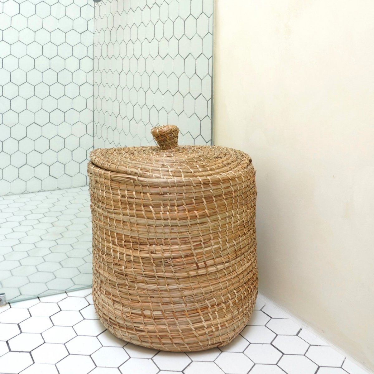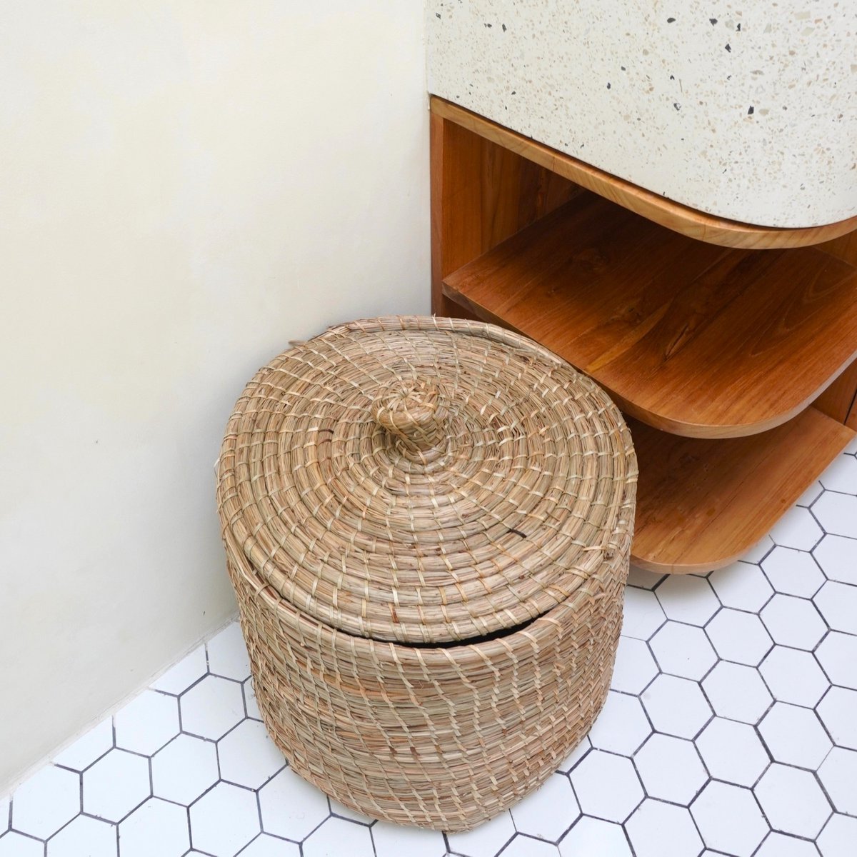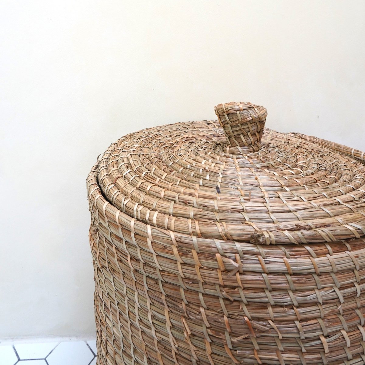 Entdecken Sie die natürliche Schönheit unseres Lantai-Korbs. Im Gegensatz zu unseren anderen Seegraskörben ist das Material dafür nicht gewebt, sondern dünne Seegrasfasern werden zu flexiblen Strängen gebunden und dann sorgfältig von Hand zusammengefügt. Das Ergebnis ist ein bezaubernder runder Korb mit einer sanften, fast organischen Form, der kleine, aber liebenswerte Unvollkommenheiten aufweist. Es ist mit einem passenden abnehmbaren Deckel ausgestattet, der ein blickdichtes Verschließen ermöglicht.