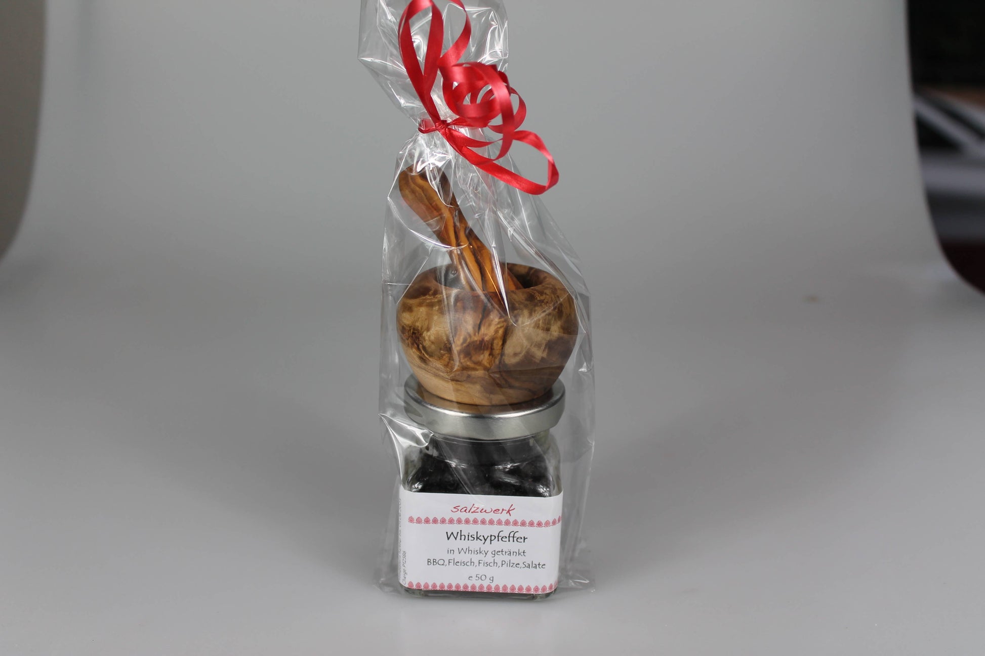 Ein ideales Geschenkset mit Whiskypfeffer im 50g Glas und ein Mini-Mörser aus Olivenholz. Whiskypfeffer ist bestens für BBQ, Fleischgerichte und Salate geeignet.